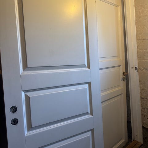 Pent brukt innerdør i hvit farge, inkludert tilhørende komplett karm og dørhåndtak. Døren har vært brukt på badet, og er i god stand. Størrelsen på døren er 200 cm x 73 cm.