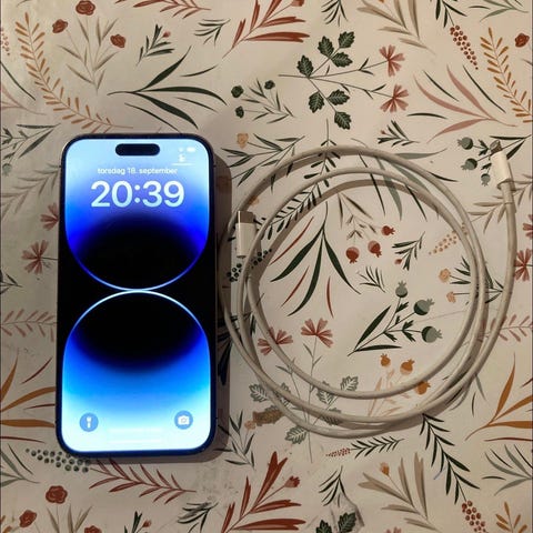 Apple iPhone 14 Pro mobiltelefon med 128 GB lagringskapasitet. Telefonen har en svart farge og er designet for personlig bruk.