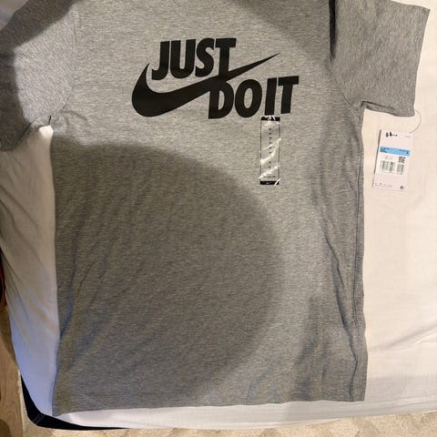 Nike Just Do It T-skjorte i blå farge, størrelse L for herre. Laget av bomullsmateriale. T-skjorten har kort erme og rund hals.