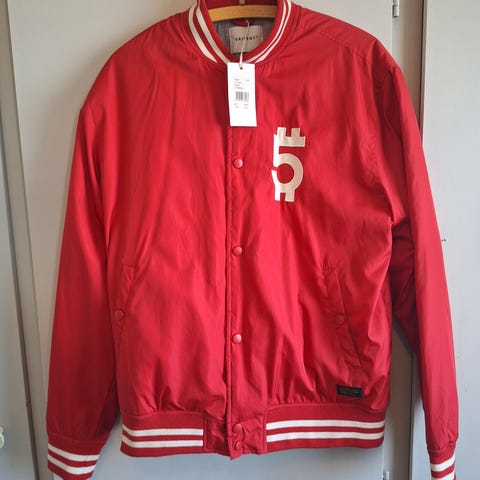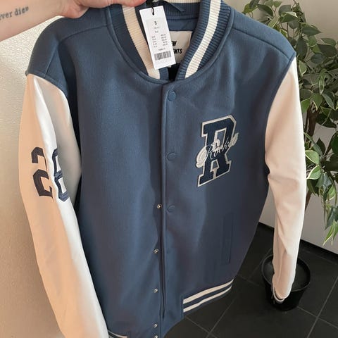 Hvit jakke med hette og glidelås, og et veldig unikt uttrykk: den ene armen har gjennomført Yankees/World Series-grafikk med metallisk/foil-detaljer og flere emblem-motiver. MLB-logo på front. Dette er en type plagg du sjelden ser på Finn – passer perfekt for deg som liker baseball, Yankees eller streetwear med litt edge.