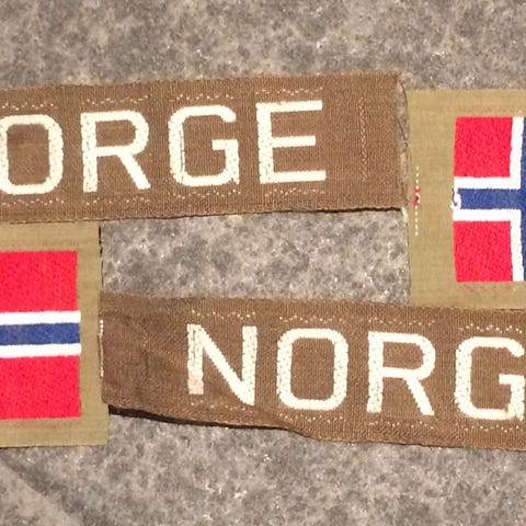 Til salgs er et utvalg broderte militære merker / emblemer, hovedsakelig norske (NORGE / norsk flagg), samt FN-merke (United Nations) og enkelte taktiske/spesialstyrke-merker.