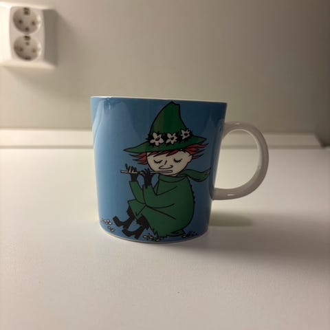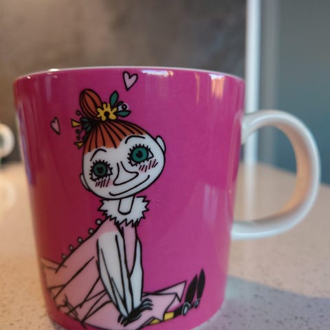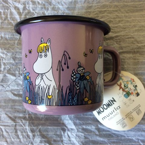 Iittala Mummi emaljekopp i rosa farge med illustrasjon av Mummi-karakter. Koppen er laget av emalje og er hvit oppi. Passer til både kald og varm drikke. Koppen er aldri brukt, kun vasket og oppbevart i skap.