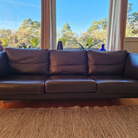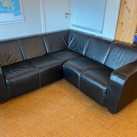 Dobbel skinnsofa med tilhørende puff selges som den er.