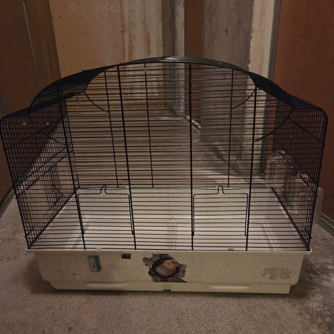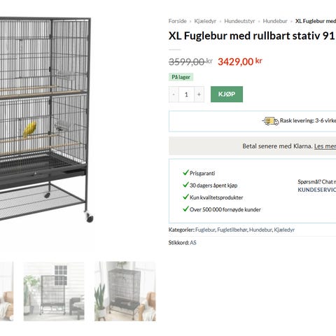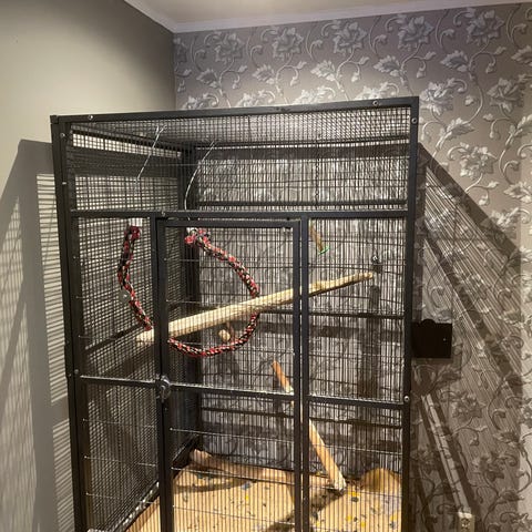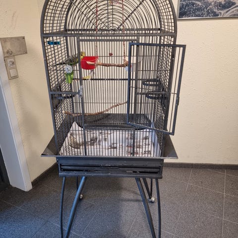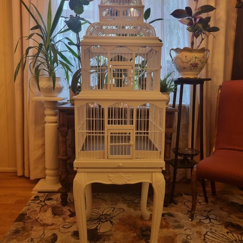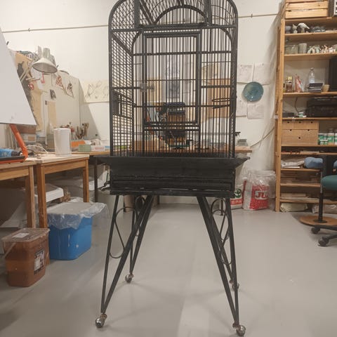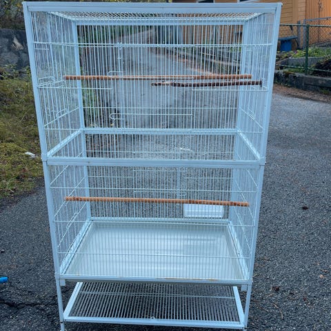 Stort fuglebur I typ plast , med 2 stk kunstige fugler, buret er til å henge opp. Høyde 63 cm. Må hentes