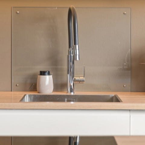 Overflaten er ripe- og bakteriefri, laget av herdet glass og keramikk, og importør er Andersens Spesialprodukter A/S, Askim; merket “Made in England”.