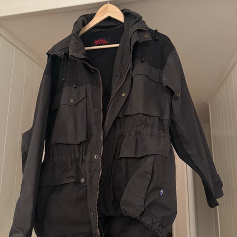 Et råskinn av en vinterjakke. Kan strekkes til vår og høst også ettersom aktivitetsnivå og klima. Verdi mange tusen kroner. To ørsmå hull, mer som rifter, i jakkas venstre nedre del etter glør. Funksjonelt er den dog i komplett og robust stand så ingen funksjonell betydning. La være nevnt at jakka i +98% av tiden har hengt tørt og fint på henger i lukket skap. Massevis av lommer og Fjällrävens velkjente og voksbare G1000 ytterstoff. Syntetisk padding som isolerer langt bedre enn dun i fuktige og våte klima (slik vintrene fremover blir mer og mer med klimaendringer).