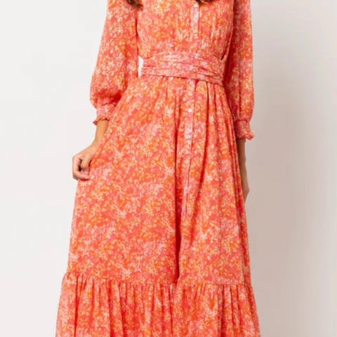 Gyri Leave Dress fra OSMINE af nor. Vakker lang midikjole fra norske OSMINE af nor med et nydelig rosa blomsterprint. Gyri Leave Dress har albuelange puffermer med smocket mansjett. Kjolen har feminin V-hals med knappelukking og smocket, elastisk panel i midjen for en feminin og flatterende passform. Det avtakbare knytebeltet skaper en fin definisjon av midjen.
