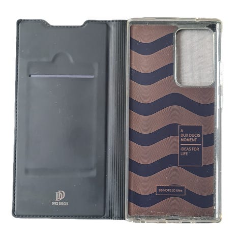 Samsung S21 Ultra 5G telefondeksel, Praktisk mobildeksel i svart kunstskinn med flip-design og kortlommer på innsiden med plass til kort og kontanter. Har vært liggende i et skap for noen år. Dekselet beskytter både skjerm og bakside og har magnetisk lukking og utsparing for kamera. Passer fint for deg som vil ha mobil og lommebok i ett.