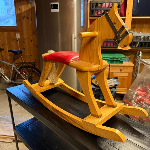 Gyngehest med rød sadel og stigbøyler