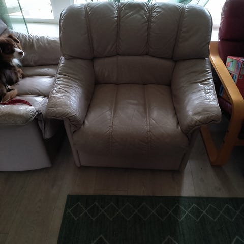 Tre seter grønn sofa gis bort mot henting. Er en tilhørende stol også. Bordet kan også følge med.