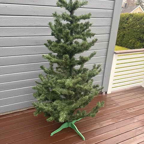 Kunstig juletre selges. Det er ca. 200 cm høyt. Det vil se bedre ut dersom greinene «fluffes» mer.