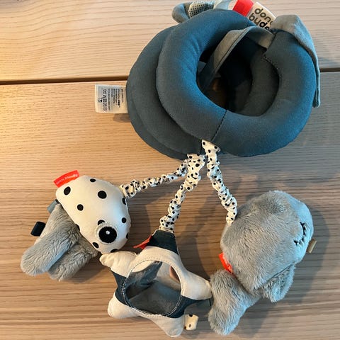 IKEA GULLIGAST lekematte for barn med myk polstring og oppheng for leker. Lekematten har grå farge og inkluderer flere hengende leker i forskjellige former og farger, noen med lyd. Designet for å stimulere barns sanser og motoriske ferdigheter.