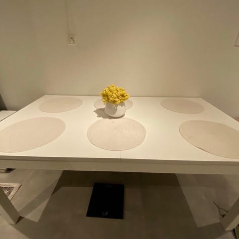 Spisebord selges da vi ønsker mindre, kan evt byttes i ett mindre. 2 av benene er sprekt opp litt.. men ikke noe man legger veldig merke til☺️
