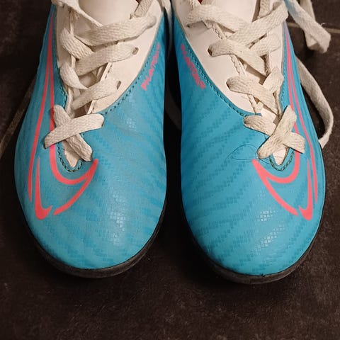 Pent brukt Nike Phantom fotballsko for barn selges sammen med adidas leggskinn.