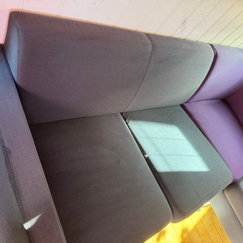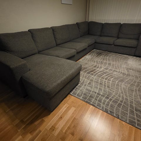 Lys grå hjørnesofa i moderne og tidløst design. Sofaen er romslig med god sitte- og liggekomfort, og passer fint til både stue og TV-krok. Trekk i slitesterkt stoff som fremstår pent brukt, med kun normale bruksspor. Ingen synlige skader eller flekker. Puter medfølger. Sofaen gir et rent og innbydende uttrykk og er enkel å kombinere med annet interiør