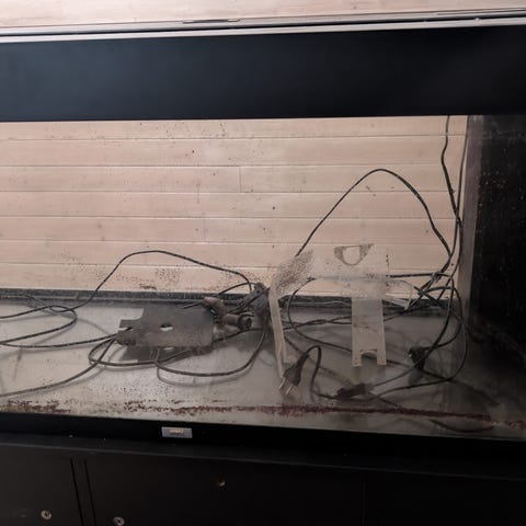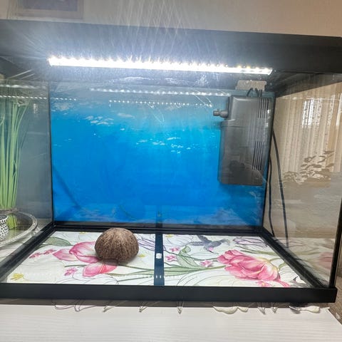 Reservert. Juwel akvarium med tilhørende skap. Pumpe har har løsnet fra glasset men fungerer fortsatt. Akvariet er utstyrt med plante, dekorasjoner og en fisk.