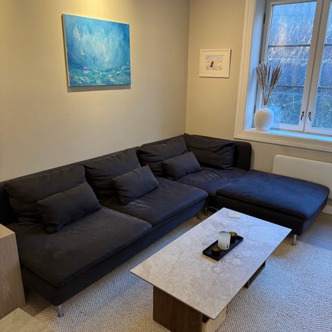 Sovesofa lite brukt, selge grunn at flytting.Liggemål 110x213 cm. B214 x H69 x D81/122 cm. Ny pris 4.500 kr