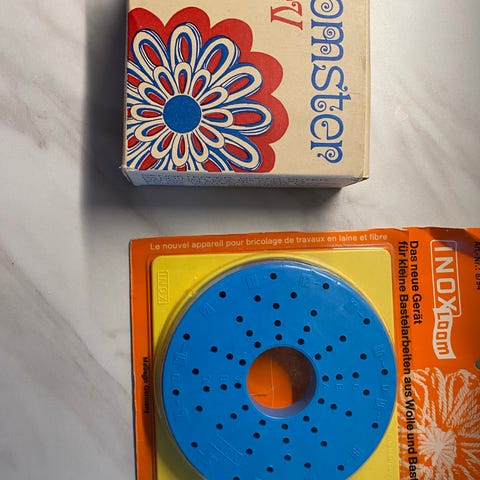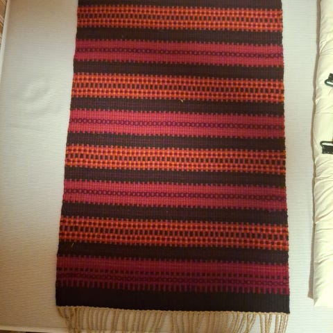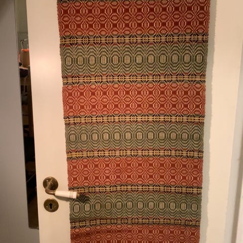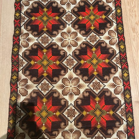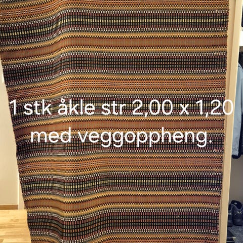 Åkle med mønster i oransje/rødt og grønt fra trøndelag med oppheng 108cmx68cm