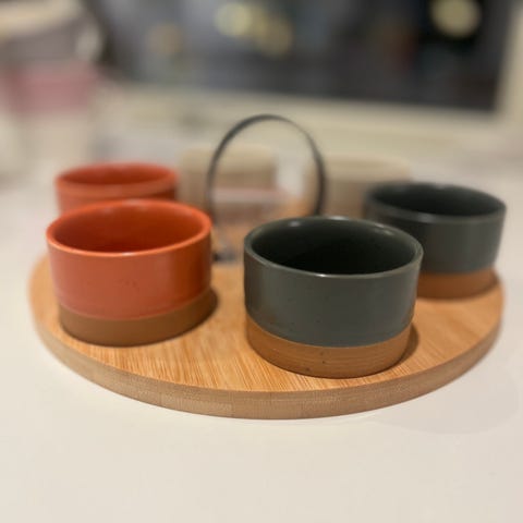 Bolia grytesett i keramikk med rød overflate. Settet inkluderer fire små gryter med lokk, egnet for tilberedning og servering av mat. Diameter: 11 cm, dybde: 4 cm. Til enkeltporsjoner.