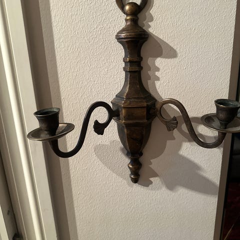 Pent brukt metall lysestake med plass til to lange stearinlys . Mål: h 22 cm b. 20 cm