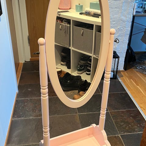 Inkluderer støttefot for bordbruk og bakplate. Pent brukt tilstand, liten slitasje gir sjarm, ingen store skader.