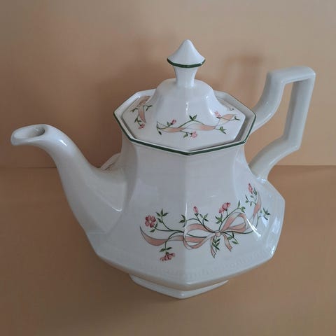 Typisk norsk 50–70-talls porselen (Egersund/Figgjo-stil, "Blå Blomster"-dekor eller lign.), bunn uten synlig merke, men solid og funksjonell.