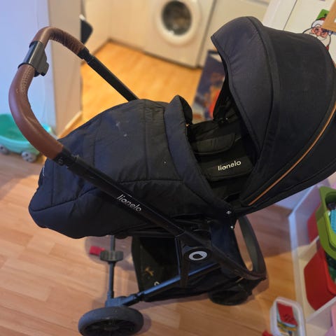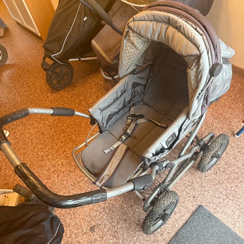 Snerten men solid, kaki/beige og sort trille med regulerbar sele, doble regulerbare hjul, rygg til å legge ned og seler. Regulerbart håndtak . Kalesje med lufteåpninger og vindu på begge sider inni