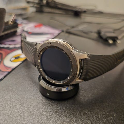 Selger en Samsung Galaxy Watch med slitt reim. Lader følger med