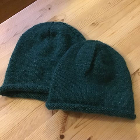 Den mønstrete er strikket i merinoull med tynn mohair følgetråd og har trippelt lag på ørene. Den helgrønne lys er strikket i ull/alpakka mix og har vanlig oppbrett.