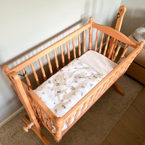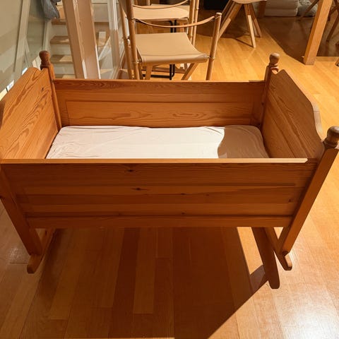 God gammel vugge fra jeg var liten og brukt til mine to barn. Nå står den bare å tar plass.