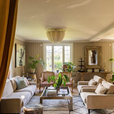 Tre seter sofa og 2 lenestoler med fot krakker.