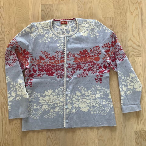 Ny Oleana cardigan i svart farge laget av merinoull og silke. Strørrelse M for dame. Hel lengde 63 cm, bredde under armene 45 cm og lengde på armen 43cm. Cardiganen har et mønsterdetalj nederst på ermene og rundt kanten.