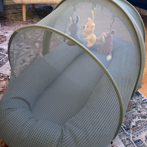 Stokke flexi bad med nyfødtinnlegg, stativ og en termometer.