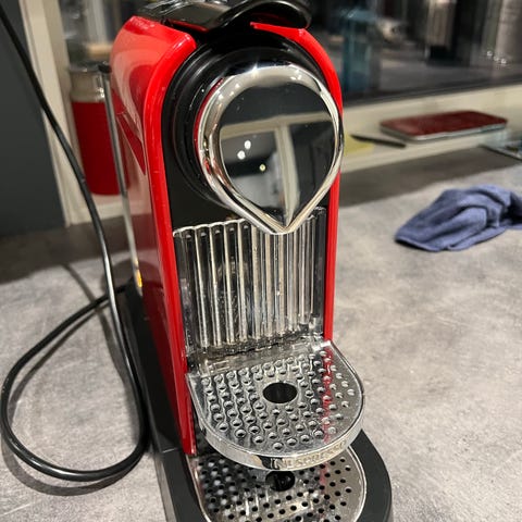 Selger da vi har kjøpt oss ny til jul. Denne er super praktisk og kapslene kan kjøpes på alle dagligvarehandler. Den er brukt, og har noen bruksmerker i beholderen for brukte kapsler, men ikke ellers. Fungerer som den skal.