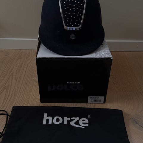 Horze ridehjelm i svart farge med matt finish. Hjelmen har en dekorativ stripe på toppen med en teksturert overflate. Den er utstyrt med justerbar stropp under haken for sikker passform. Designet for å gi beskyttelse ved ridning.