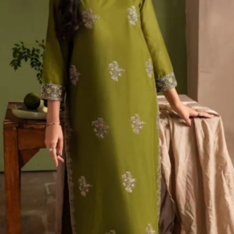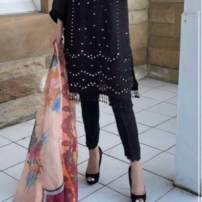 Klær fra Zeenat and Zoha, størrelse L, stoffet er cambric. Broderi på buksen, ermer og hals slik på bilde. Fargen er mer marineblå i virkeligheten. Ubrukt