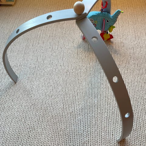 Vognleke/vognrangle/vognlenke i tre fra Solini. Friske farger med en liten bjelle. Kan klypes fast på solskjerm eller andre steder på vogn og babygym for eksempel.