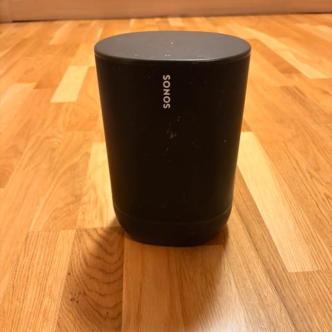 Sonos trådløs høyttaler med grått stofftrekk og hvit base. Designet for trådløs lydavspilling.