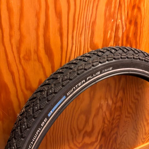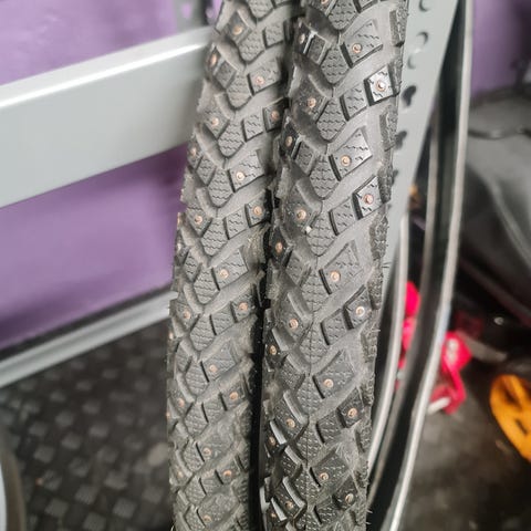 Ett enkelt dekk med 208 pigger og refleksstripe. Passer typisk til elsykkel eller hybridsykkel. Til 28"/622/700 felg. Må hentes. Ny pris 599
