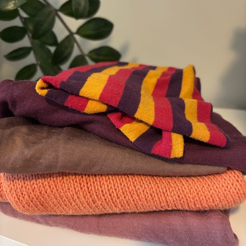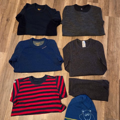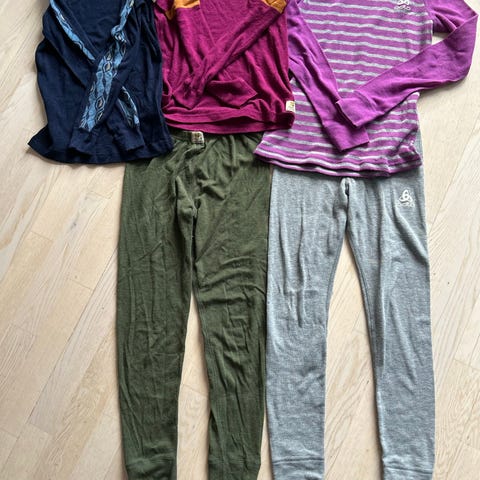 En rød ulljakke, en rosa ulltrøye, et sett bukse og genser superundertøy, og en rosa fleece genser