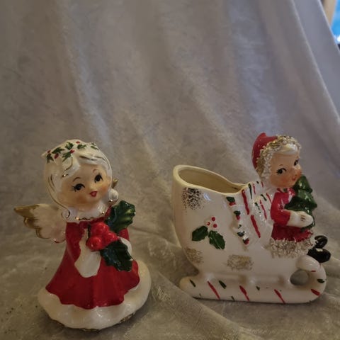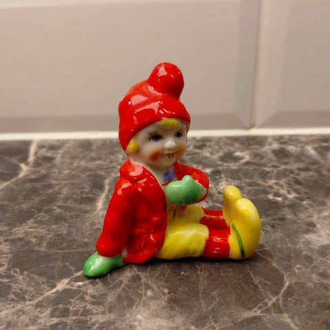 Diverse julefigurer i keramikk og gips. Snømannen er et lite stearinlys. Se måler ca 2-5cm høye. Noe slitasje. Pris er samlet.