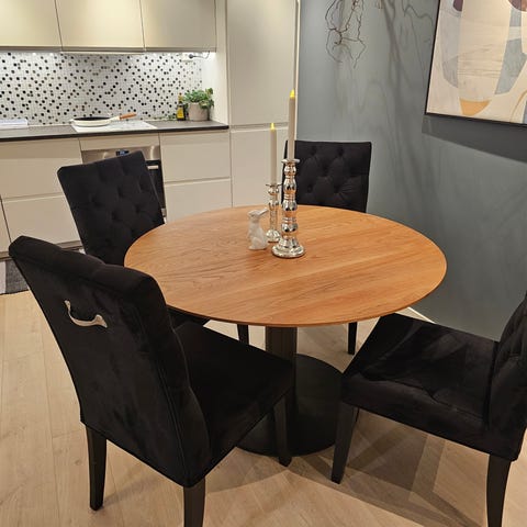 Kjøkkenbord i eik. Er blitt pusset ned og oljet med hvit olje. Noen bruksmerker i bordplaten. Kan ikke forlenges. Må hentes