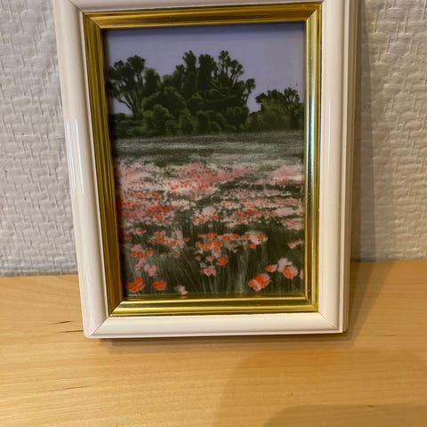 Vet ikke hva slags type bilde det er. Tror det er et grafisk trykk. Det heter Øvrevold og måler ca 17x16,5cm. En hilsen på baksiden av bildet. Bittelitt slitasje på ramma.