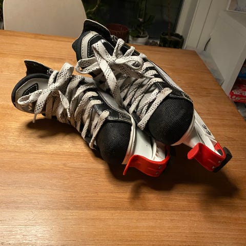 Selger høckeyskøyter (str 32), kølle (ca 1,01 m fra bunn til topp) og hjelm (xs) samlet for 500 kr. Pent brukt!