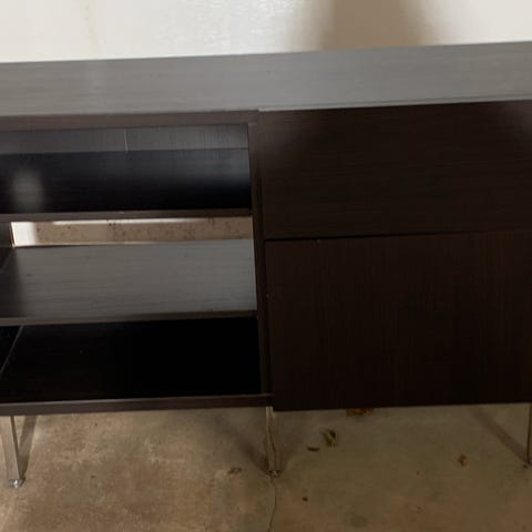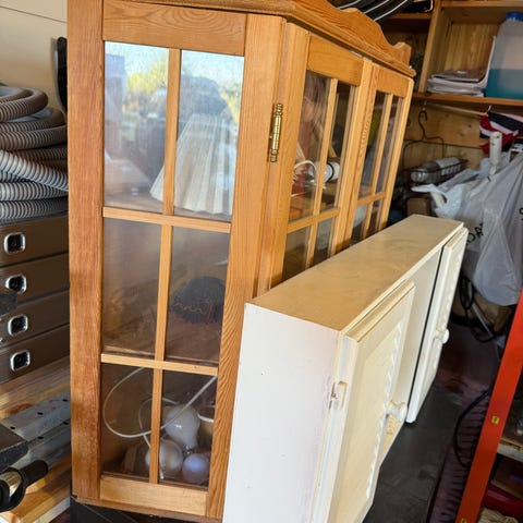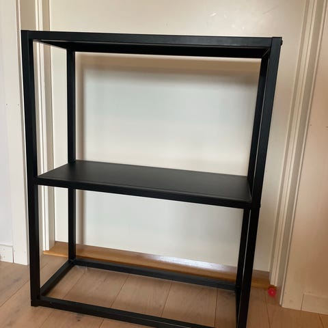 To stk hyller med skap i bunn.
