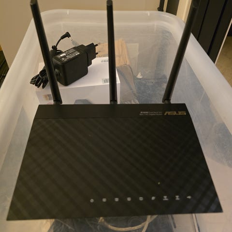 Asus RT-AC66U Dual-Band Gigabit Router med tre antenner. Støtter 802.11ac (WiFi 5) som kan gi hastigheter opp mot 1300 Mbps. Enheten har fire Gigabit LAN-porter, en WAN-port og USB. Ruteren kan sette opp både 2,4 GHz og 5 GHz nettverk, samt gjestenettverk på begge bånd samtidig, og kan også brukes som FTP-, medie-, printer- og filserver. Har du flere ASUS-rutere kan du utvide nettverket ditt med AiMesh. Nypris var 1500,-. Strømadapter følger med.