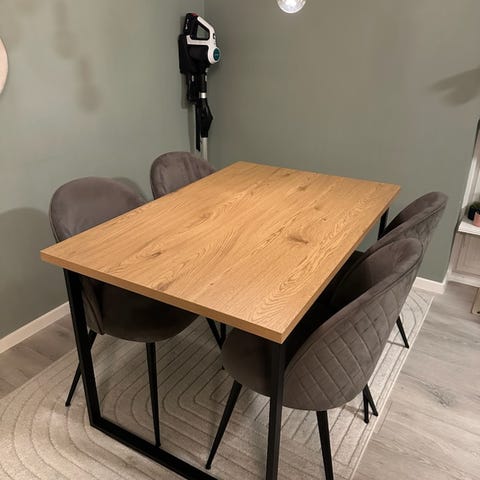 Spisebord med ileggsplate, høyde 74 cm, bredde 115 cm. Malt, hvite ben og grå plate. Trenger litt kjærlighet, litt pussing og by maling. 4 blå stoler følger med. Dette er godt brukt, men hjelper nok å skru til skruer under stolene 👍