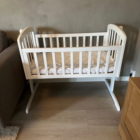 Bedside crib som kan justeres i 6 forskjellige høyder. Madrass og laken medfølger.