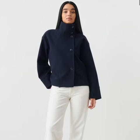 Cape med knytbart belte ved midjen. Kåpen er marineblå og har lange, brede ermer. Den har oversized passform, høy krage og knapper på toppen.