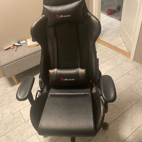 Jeg selger denne gamingstolen fordi jeg ikke lenger har plass til den. Det er en Arozzi Verona Pro (2) i karbonsort, og nyprisen var 3500 kr. Jeg har brukt stolen i omtrent fire år, og den er fortsatt i veldig god stand. Alt fungerer som det skal, og den har ingen store skader, bare en liten overflateskade. Jeg har vært veldig fornøyd med stolen; den er behagelig å sitte i og har god tyngde, så den triller ikke unna når du bruker den. Ta gjerne kontakt hvis du har spørsmål.